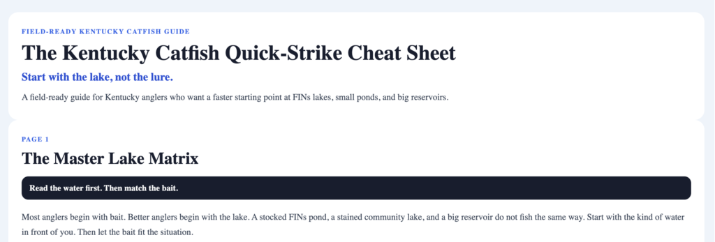 Download the Kentucky Catfish Lake-First Quick-Strike Cheat Sheet. This fast, field-ready PDF helps you read the water first, then match your bait to the kind of lake or reservoir you are standing on.